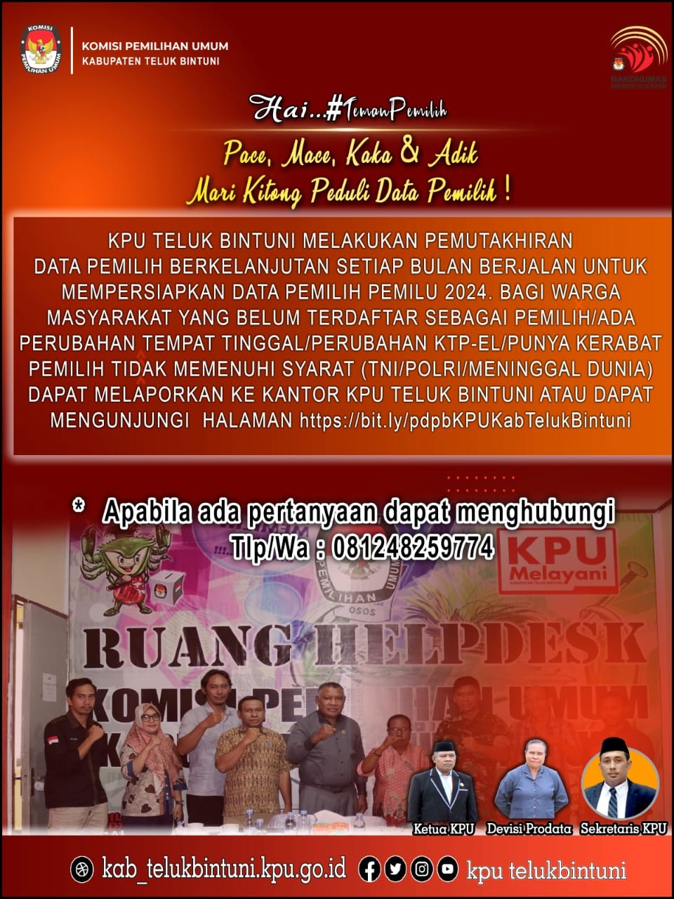 Warga Kabupaten Teluk Bintuni yang belum terdaftar sebagai pemilih, baru berusia 17 tahun (masuk pemilih pemula), mengalami perubahan identitas kependudukan, keluarga yang sudah TNI/Polri, dan Keluarga yang sudah meninggal, silahkan mendaftar/melapor/memperbaiki identitas daftar pemilih dengan mengisi formulir https://bit.ly/pdpbKPUKabTelukBintuni