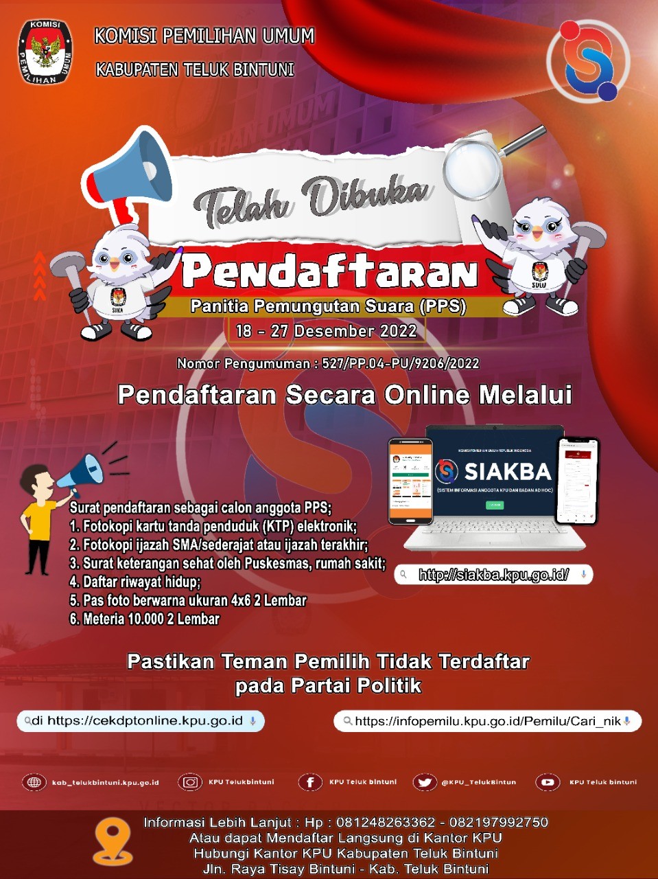 Temanpemilih - KPU Teluk Bintuni, telah membuka pendaftaran calon anggota PPS, Mulai tanggal 18 s/d 27 Desember 2022.