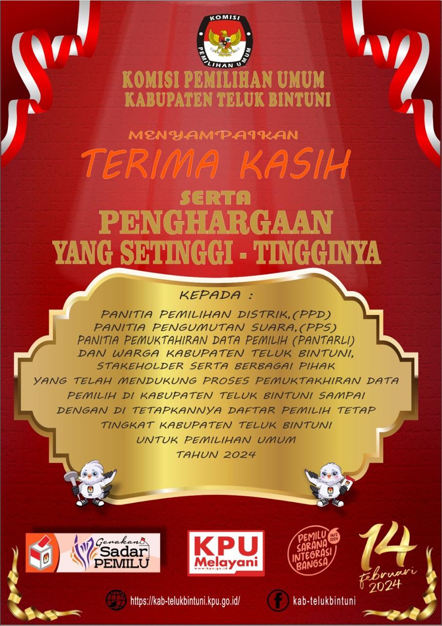 #TemanPemilih, KPU Kabupaten Teluk Bintuni mengucapkan terima kasih dan mengapresiasi yang setinggi-tingginya kepada Panitia Pemilihan Distrik (PPD), Panitia Pemungutan Suara (PPS) dan Pantarlih Se-Kabupaten Teluk Bintuni atas telaksana dan suksesnya Rapat Pleno Rekapitulasi Daftar Pemilih Tetap tingkat Nasional dalam Pemilihan Umum Tahun 2024.