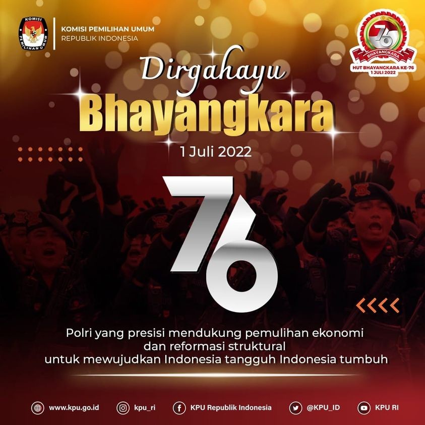 #TemanPemilih, segenap jajaran KPU RI mengucapkan Selamat Hari Bhayangkara ke-76. Terimakasih telah melindungi, melayani dan mengayomi seluruh masyarakat Indonesia Semoga POLRI semakin maju dalam memberikan pelayanan terbaik bagi bangsa dan negara.