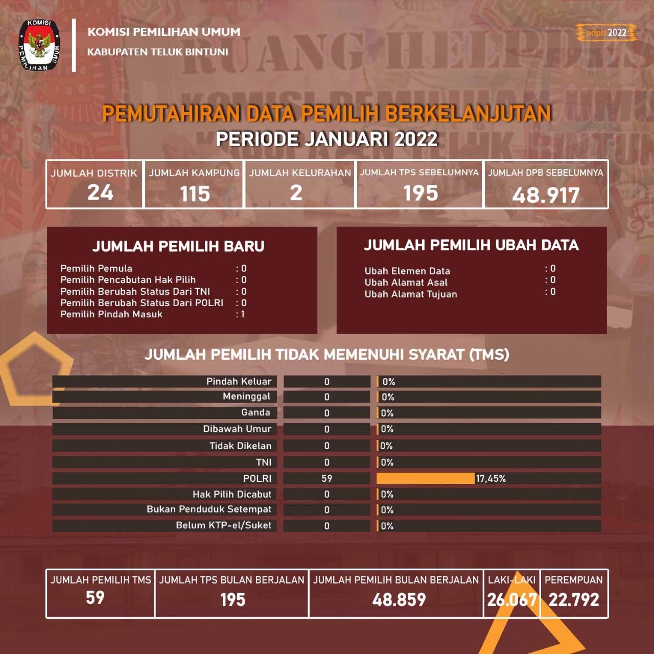 Rekapitulasi Daftar Pemilih Berkelanjutan dengan jumlah sebanyak 48.859 pemilih yang tersebar di 24 Distrik, terdiri dari laki-laki sejumlah 26.067 pemilih dan perempuan sejumlah 22.792 pemilih, Rekapitulasi Daftar Pemilih Baru dari hasil Pemutakhiran Data Pemilih Berkelanjutan dengan jumlah sebanyak 1 pemilih, dengan rincian laki-laki sejumlah 0 pemilih dan perempuan sejumlah 1 pemilih, yang tidak memenuhi syarat (TMS) sebanyak 59 pemilih, dengan rincian laki-laki sejumlah 54 pemilih dan perempuan sejumlah 5 pemilih.